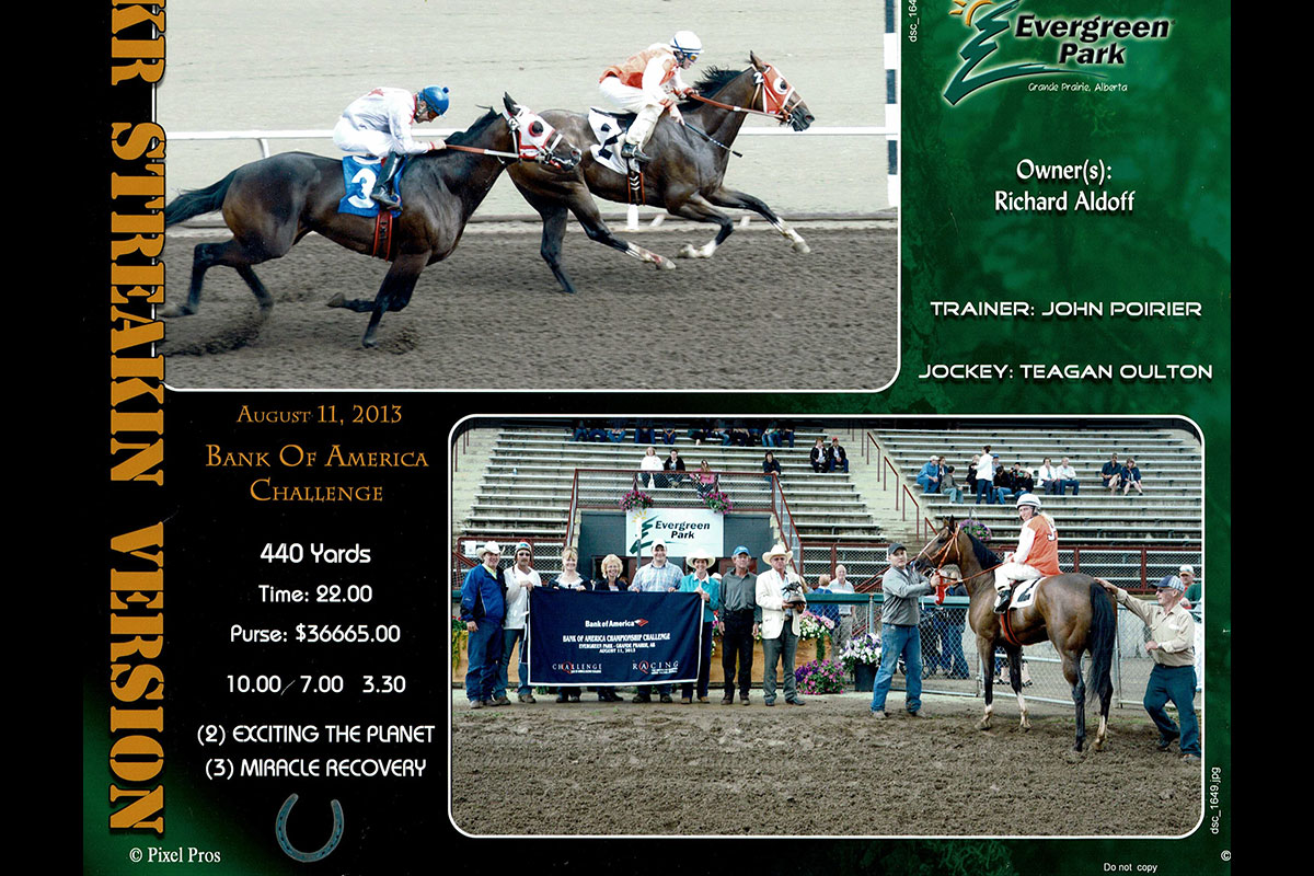 John has had some good wins during his time in 'retirement' – most people would not think that running a racing a barn can be described as retirement! John has trained a few Quarter Horses, and modestly jokes that he "had a little luck" with them. His biggest and most memorable Quarter Horse win was with KR Streakin Version in 2013, when he won the $36,000 Bank of America Championship Challenge race at Evergreen Park. Teagan Oulton was in the irons, and John says "I love a tough little girl jockey. They've got grit!"