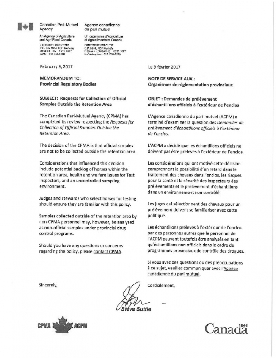 The Canadian Pari-Mutuel Agency (CPMA) has completed its review respecting the Requests for Collection of Official Samples Outside the Retention Area. The decision of the CPMA is that official samples are not to be collected outside the retention area. Considerations that influenced this decision include potential backlog of horses within the retention area, health and welfare issues for Test Inspectors, and an uncontrolled sampling environment.