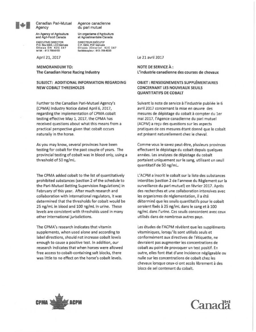 Further to the Canadian Pari-Mutuel Agency's (CPMA) Industry Notice dated April 6, 2017, regarding the implementation of CPMA cobalt testing effective May 1, 2017, the CPMA has received questions about what this means from a practical perspective given that cobalt occurs naturally in the horse.