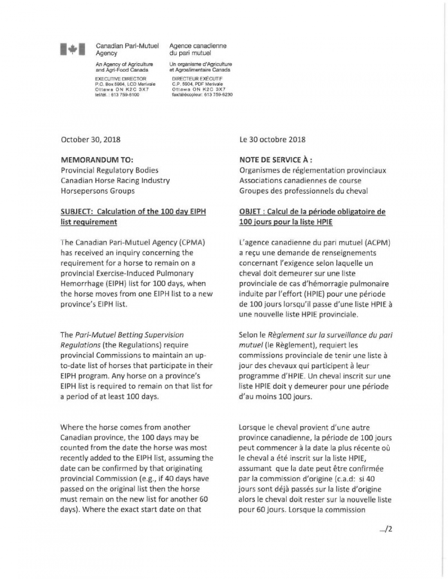 The Canadian Pari-Mutuei Agency (CPMA) has received an inquiry concerning the requirement for a horse to remain on a provincial Exercise-Induced Pulmonary Hemorrhage (EIPH) list for 100 days, when the horse moves from one EIPH list to a new province's EIPH list.