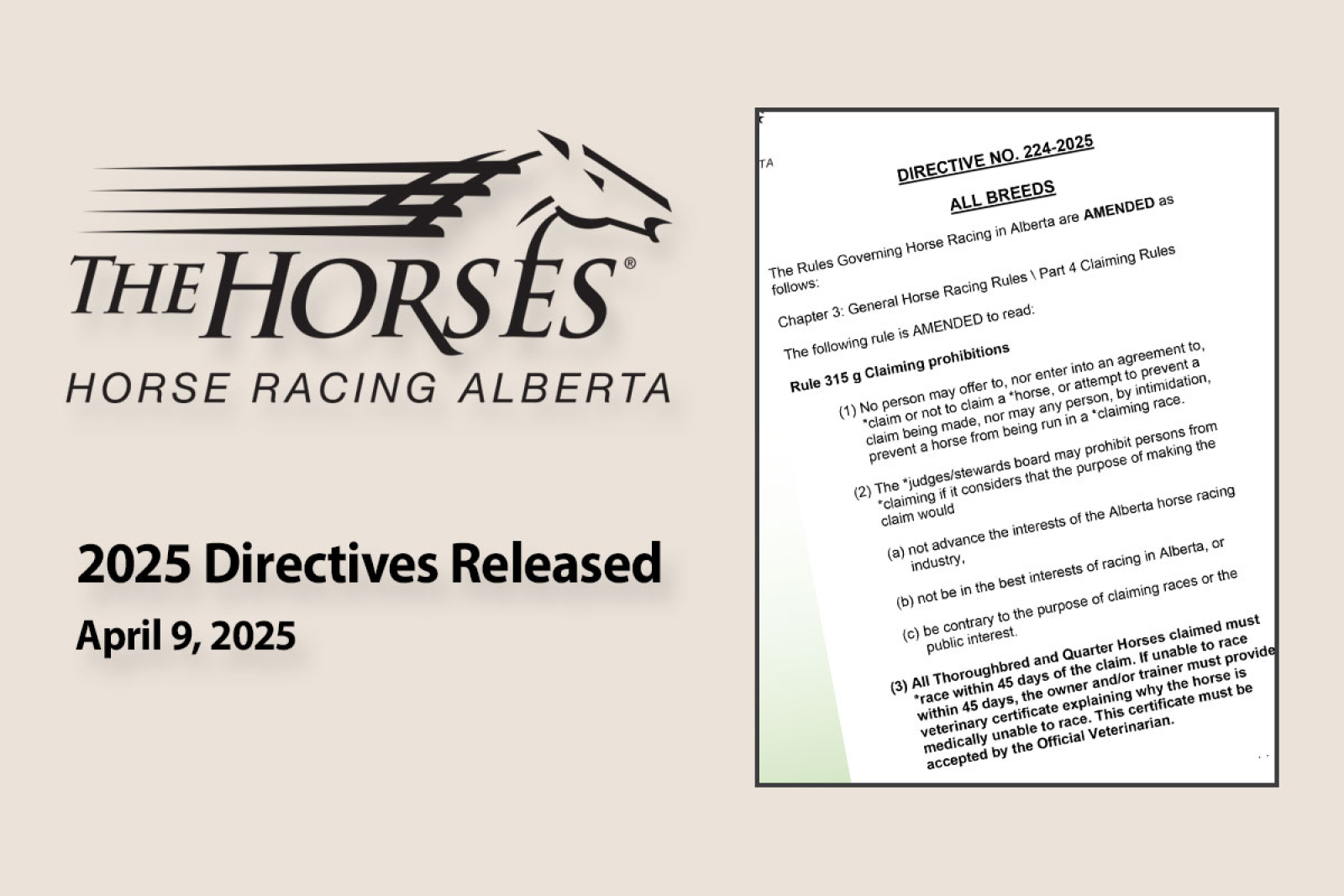 Horse Racing Alberta is pleased to release the 2025 Directives for the Rules Governing Horse Racing in Alberta. We extend our sincere thanks to all stakeholders who submitted petitions and provided valuable feedback during the process.