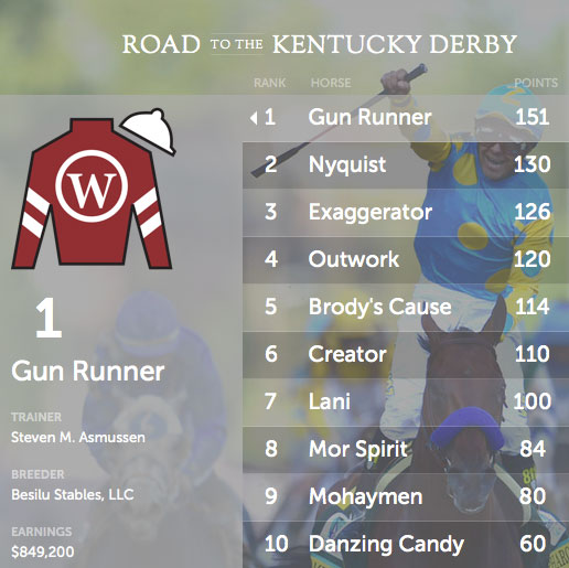 The horses known to be entered in the Kentucky Derby are (in order of preference by points earned on the Road to the Kentucky Derby (with jockeys): Gun Runner (Florent Geroux); Nyquist (Mario Gutierrez); Exaggerator (Kent Desormeaux); Outwork (John Velazquez); Brody’s Cause (Luis Saez); Creator (Ricardo Santana Jr.); Lani (Yutaka Take); Mor Spirit (Gary Stevens); Mohaymen (Junior Alvarado); Danzing Candy (Mike Smith); Destin (Javier Castellano); Suddenbreakingnews (Luis Quinonez); Oscar Nominated (Julien Leparoux); Shagaf (Joel Rosario); Whitmore (Victor Espinoza);Tom’s Ready (Brian Hernandez Jr.); My Man Sam (Irad Ortiz Jr.); Majesto (Emisael Jaramillo); Trojan Nation (Aaron Gryder) and Mo Tom (Corey Lanerie).
