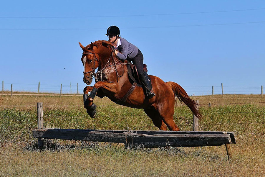 Lindsay spent some time with Hunter while he adjusted to his new surroundings, and when she tacked him for the first time a week later they set off at a walk and Lindsay knew they were going to click. All Hunter knew was how to gallop around a track, so they spent some time on foundation work for a couple of months, and in June their training for the Thoroughbred Makeover began. Lindsay describes Hunter as “willing, game, trusting and smart” so he picked up his first formal lessons very quickly and after three months of training he was moving through their flatwork and jumping courses with ease. In August, Lindsay and Hunter entered their first show, and with his huge stride and game attitude he displayed his true personality and jumped everything she put him at and even though they didn’t win any classes, he showed great form and lots of natural talent. Lindsay and Hunter joined the Calgary Hunt Club, and in September they rode out across country with other horses which could have been a tremendous challenge for them both – the jumps on a hunt are solid and when you are running along in a pack horses can easily spook or get into a race. The confidence they have in each other and the bond they have built emerged on the hunts and he took every jump in stride and they had some exhilarating rides!