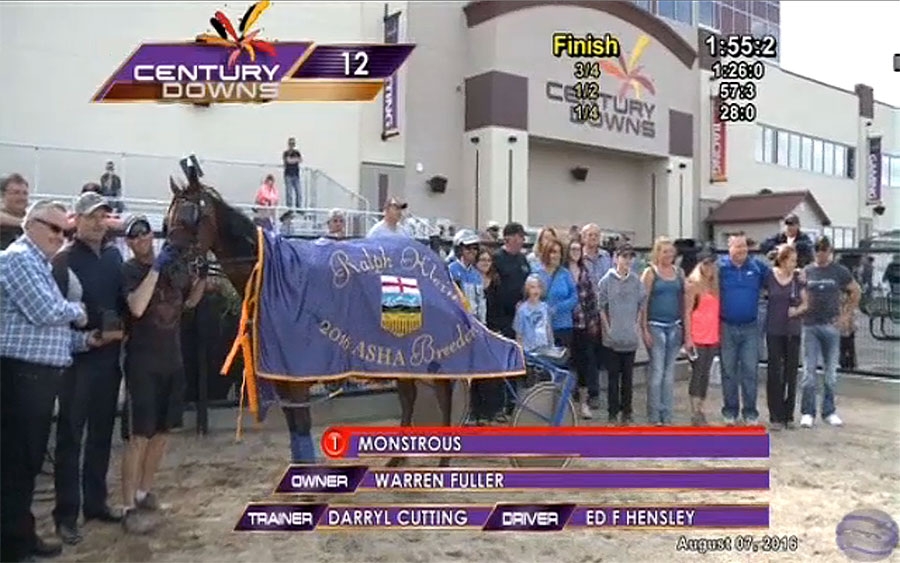 "It would be great to be able to get into the Final again," said Fuller. "That's all we're hoping for right now." It would be a monumental upset if Monstrous doesn't qualify. After all, the three-year-old filly has finished first or second in 13 of her 14 starts this year. In her last start, the $80,000 Alberta Sire Stake Super Series Final for three-year-old fillies at Balzac's Century Downs, Monstrous blew the doors off everyone rocketing away to a four and a half length victory. As usual, she came from far behind. With only one horse headed going into the backstretch, Monstrous tipped three wide and roared past the pace setters taking a commanding lead and never relinquishing it.