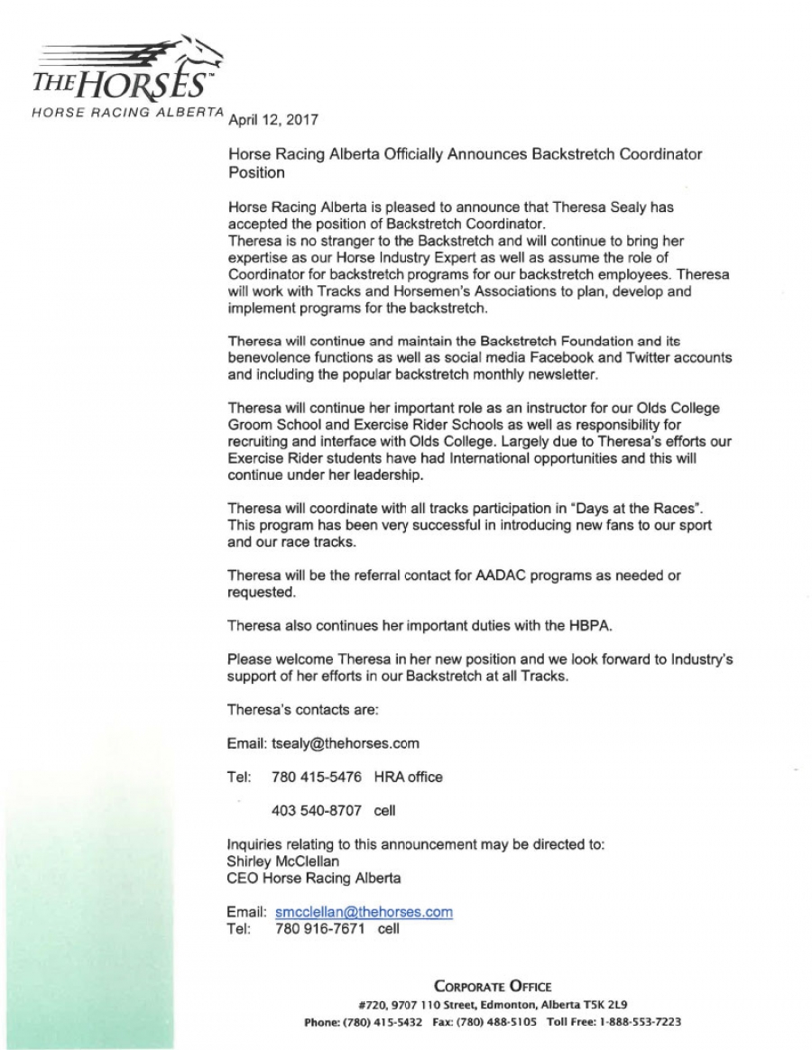 Horse Racing Alberta is pleased to announce that Theresa Sealy has accepted the position of Backstretch Coordinator.