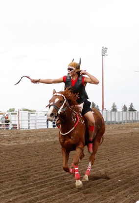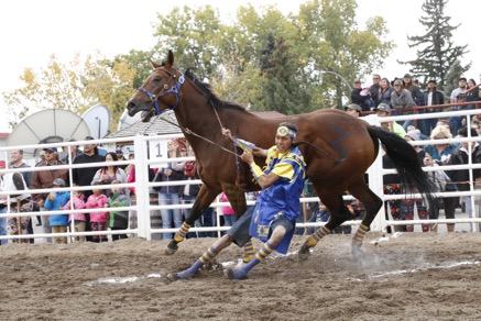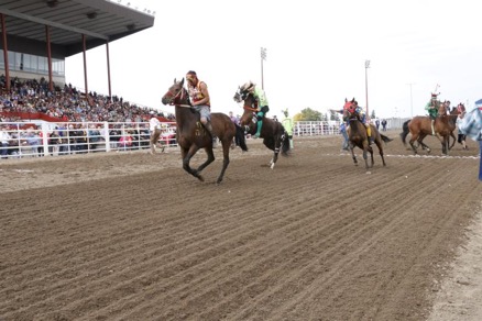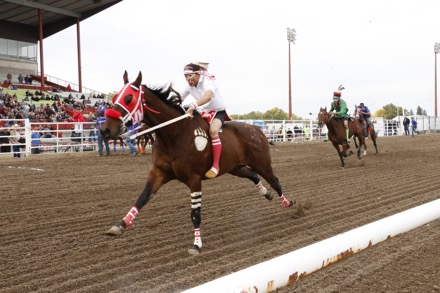 This is how racing works in the Canadian Indian Relay Race — each team has a collaboration of 3 horses and 1 rider, 1 catcher, 1 exchange holder and 1 back holder. At the start of the race, the rider will have both feet on ground while catcher holds horse. The rest of the teams will be in designated boxes located in front of the grandstand. The start will be at the sound of a horn and the rider will climb aboard horse and begin racing around the track. The horse and rider will complete one round of track. The rider will ride to designated box where the catcher stops the horse and rider dismounts — where he mounts horse number 2 — held by exchange holder and races and again around track. The rider will ride horse number 2 to designated team box where catcher stops the horse, the rider dismounts, and mounts the final horse number 3 and races around track one final time. Extreme Ciaos! Excitement! Pure skill, horsemanship and guts!! The timed winner is declared by fastest time after judges submit timesheets and penalties assessed.
