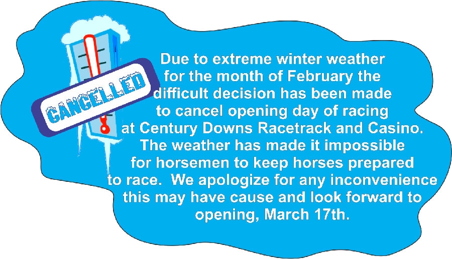 Due to extreme winter weather for the month of February the difficult decision has been made to cancel opening day of racing at Century Downs Racetrack and Casino.