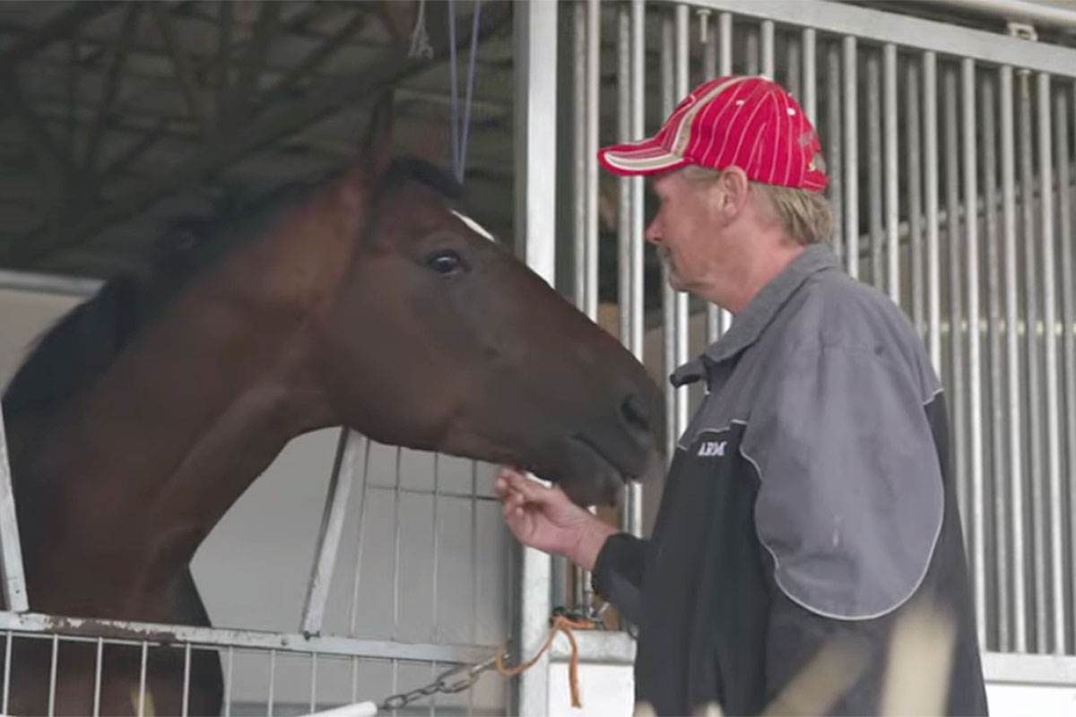 Trainer Jim Brown with Tony's Tapit in the barns at Century Mile