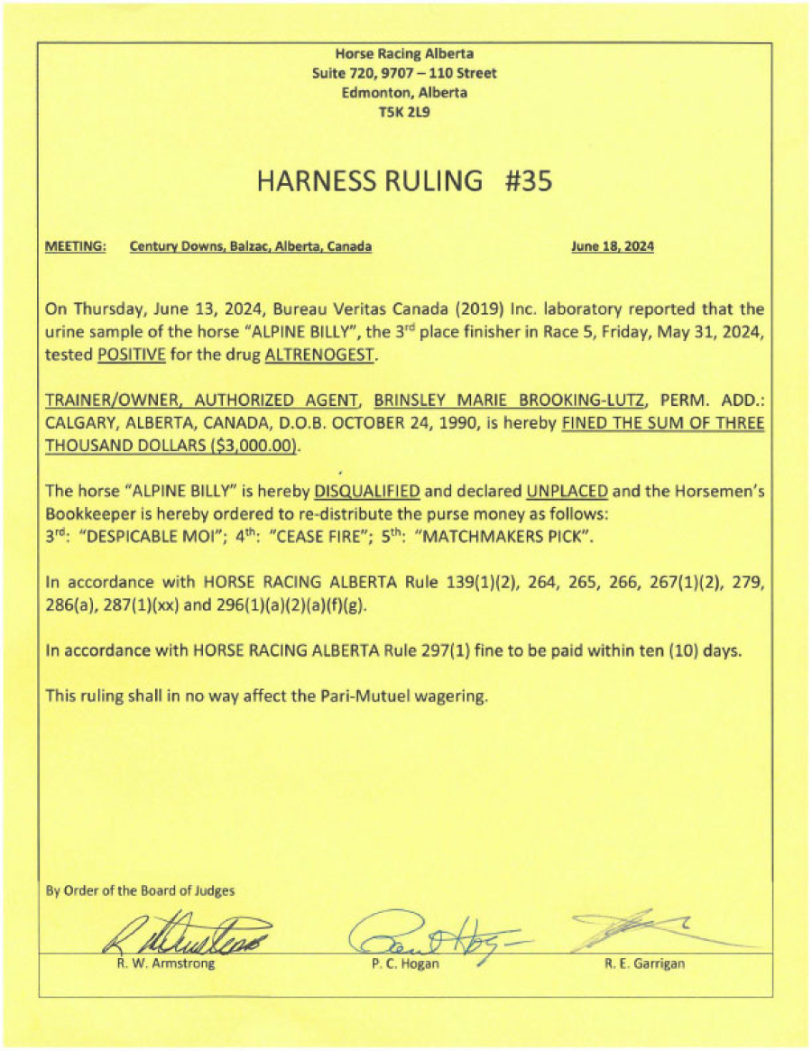Fined $3,000, horse disqualified and declared unplaced