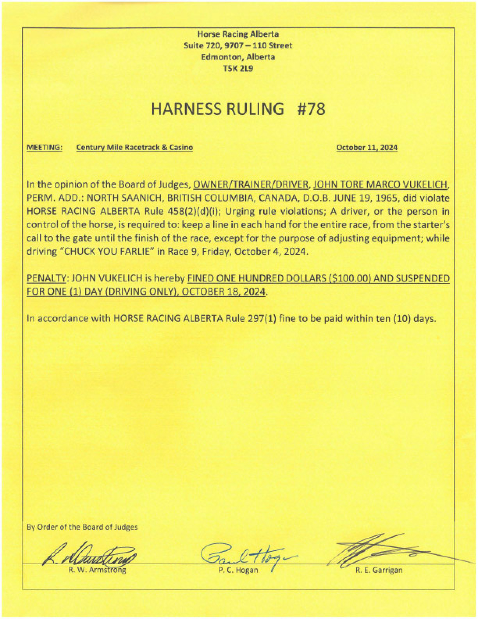 Fined $100, suspended for 1 day (driving only)