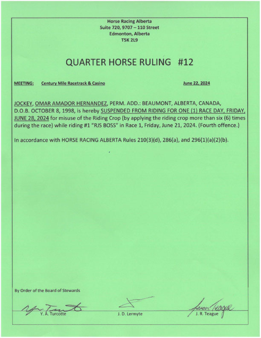 Suspended from riding for 1 day (4th offence)