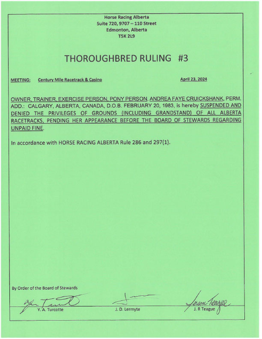 Suspended and denied priviledges pending appearance before board of stewards, unpaid fine