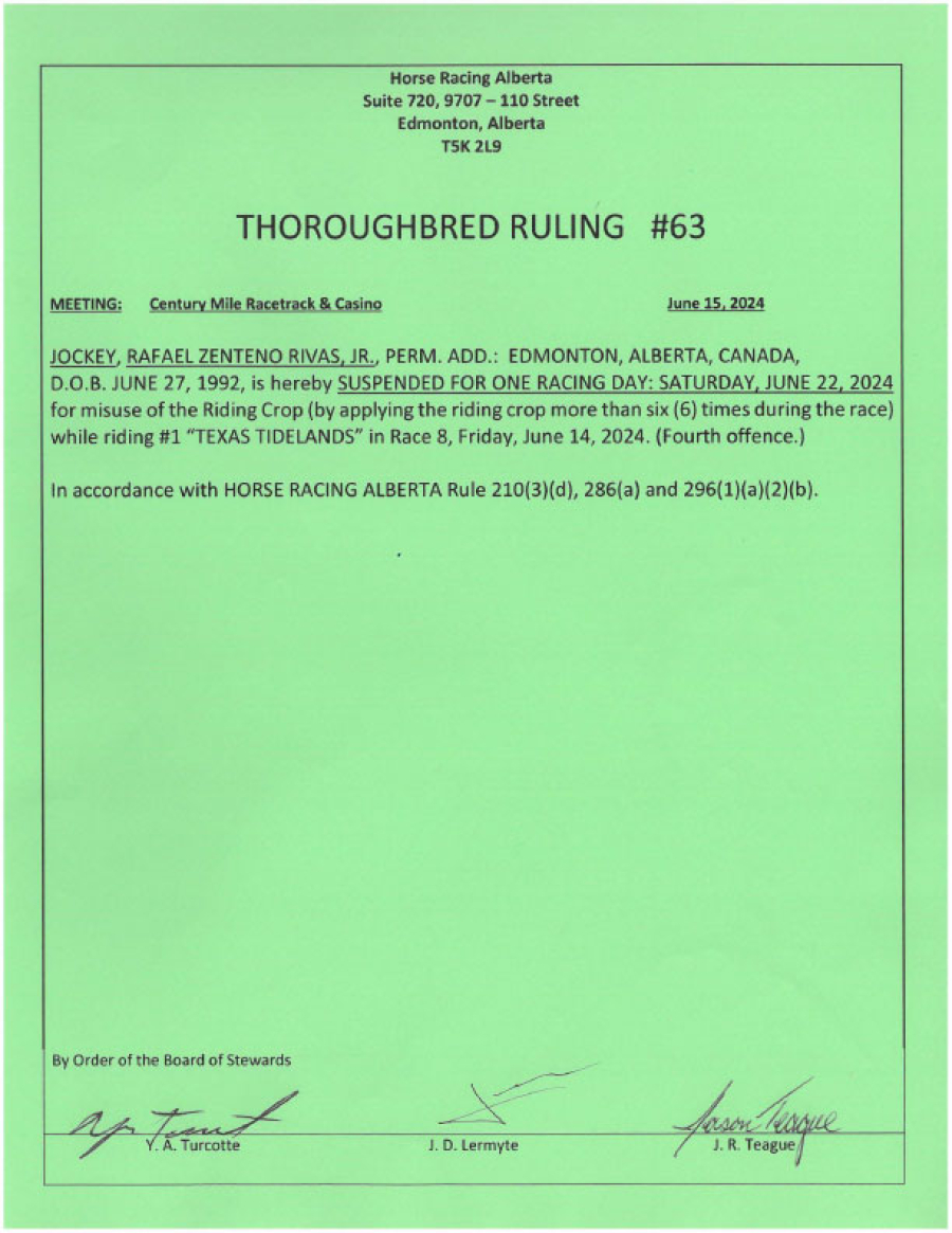 Suspended from riding for 1 day (4th offence)