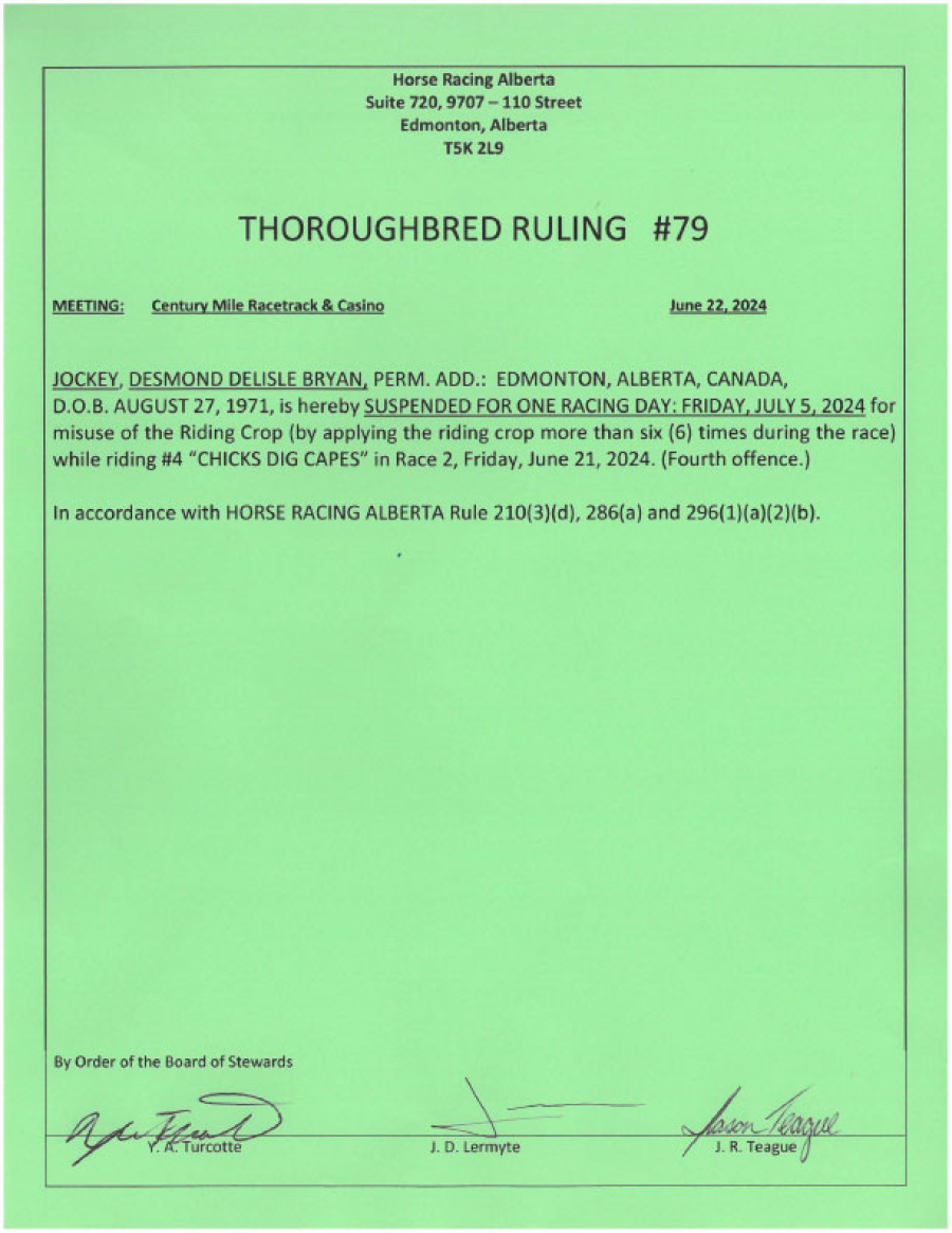 Suspended from riding for 1 day (4th offence)