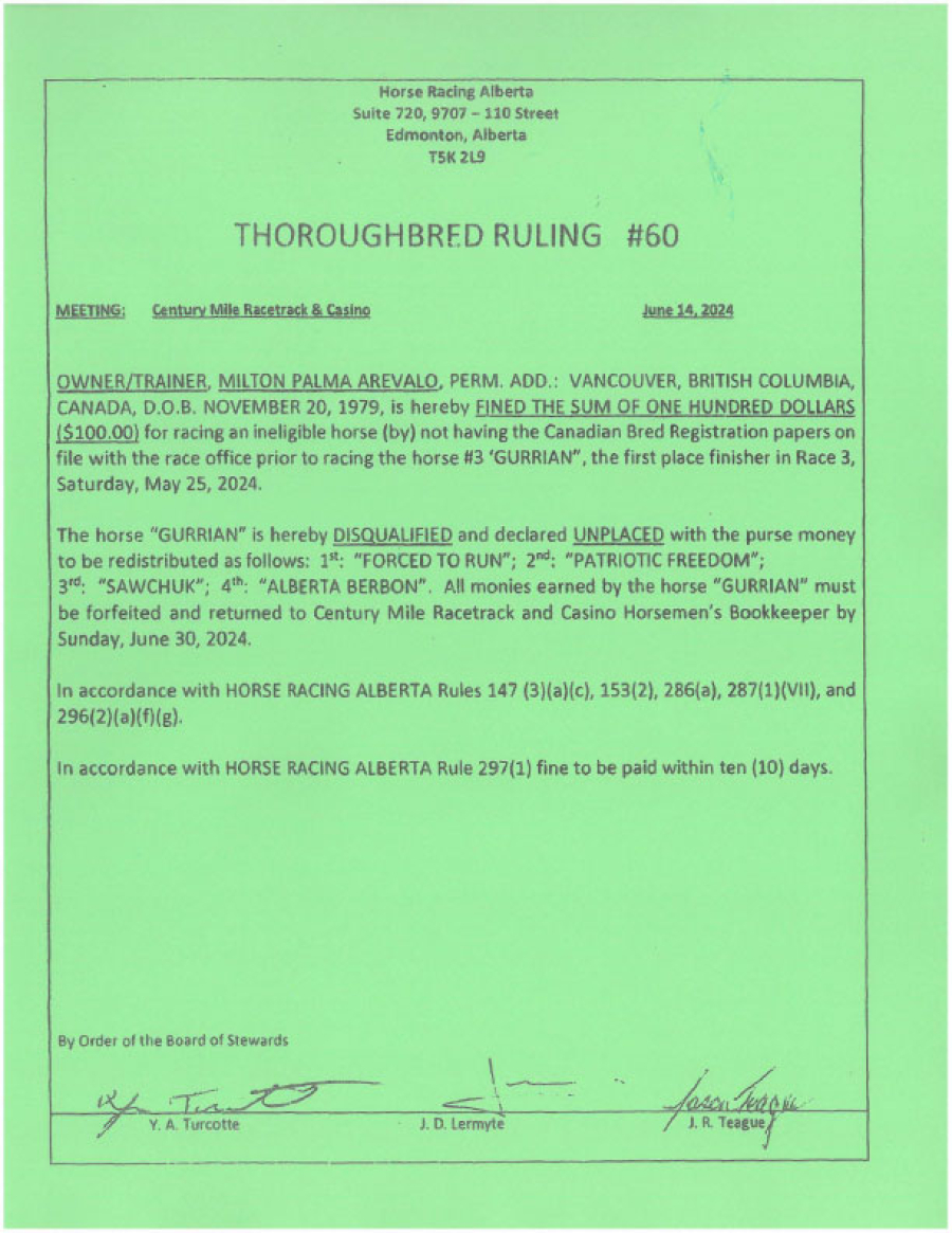 Fined $100, disqualified and declared unplaced, purse redistributed
